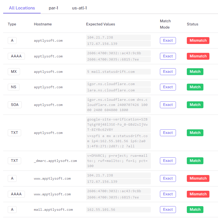 DNS problems are notoriously difficult to debug. A misconfigured record or unauthorized change can take down your entire service while your servers remain perfectly healthy. StatusDrift monitors your DNS records and alerts you to anomalies.
