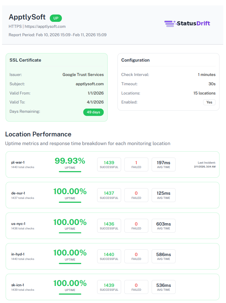 Give each client their own branded status page on their domain. Your clients get professional status communication without seeing StatusDrift.